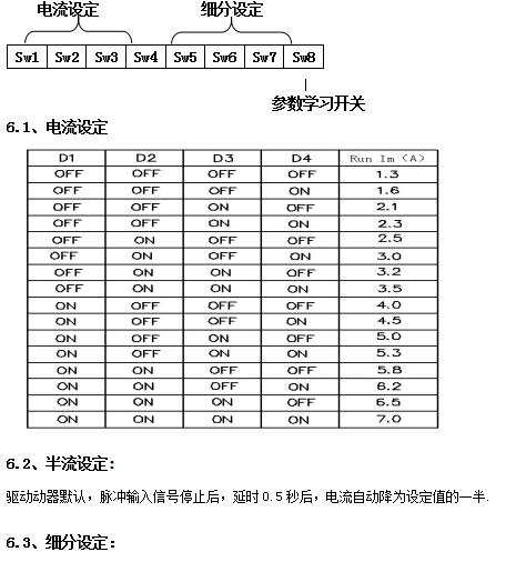 驅(qū)動(dòng)器采用八位撥碼開關(guān)設(shè)定細(xì)分精度、動(dòng)態(tài)電流、靜止半流以及實(shí)現(xiàn)電機(jī)參數(shù)學(xué)習(xí)與PID整定。八位撥碼開關(guān)詳細(xì)描述如下: