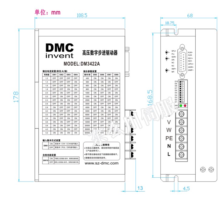 DM3422 采用最新 32 位DSP 處理器為運(yùn)算核心,定位于高技術(shù)水準(zhǔn)通用全隔離型的三相高壓大功率步進(jìn)電機(jī)驅(qū)動(dòng)器。它以比交流伺服更為先進(jìn)的軟件算法結(jié)合強(qiáng)勁的三相功率推動(dòng)單元.卓越的性能表現(xiàn)在,高速大力矩輸出,低噪聲,低振動(dòng),低發(fā)熱,由于采用內(nèi)置動(dòng)態(tài)微細(xì)分技術(shù),即使在低細(xì)分的條件下,也能夠達(dá)到高細(xì)分的效果,低中高速運(yùn)行都很平穩(wěn),噪音超小。驅(qū)動(dòng)器具有電機(jī)參數(shù)學(xué)習(xí)及控制參數(shù)自動(dòng)整定,及運(yùn)行過程微調(diào)自適應(yīng)參數(shù)的變化功能,能夠針對(duì)不同電機(jī)自動(dòng)生成最優(yōu)運(yùn)行參數(shù),最大限度發(fā)揮電機(jī)的性能。