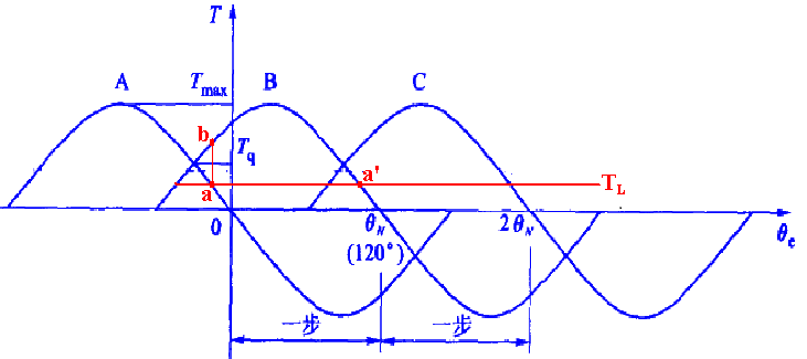A相——B相::轉子位置來不及變化(慣性),矩角特性變為曲線B,Tb>TL ——轉子加速——向新平衡點a·運動。